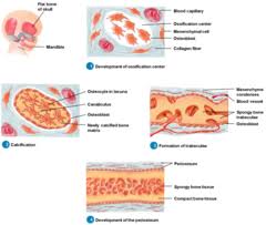 . . This process ouucur in the well vascularized connective tissue. Intramembranous Ossification bone devlops of embryonic mesenchymal tissue that froms an ossification center . mesenchymal cell different directly into osteoblast. osteoblast secret osteod matrix componets that calcify and from trabeculae and woven bone . osteoblast trapped into matrix and called osteocytes these cell reside in small spaces called lacune and are connected with neighboring osteocytes by their cytoplasmic process within matrix canaliculi . continued matrix secretion calcification and trabecular growth lead slowly to the fusion of neighboring ossification center and gradually produce layer of compact bone . the compact bone layers broadly enclose region of cancellous bone with marrow . deposition of concentric lamellae of matrix around blood vessel from osteons